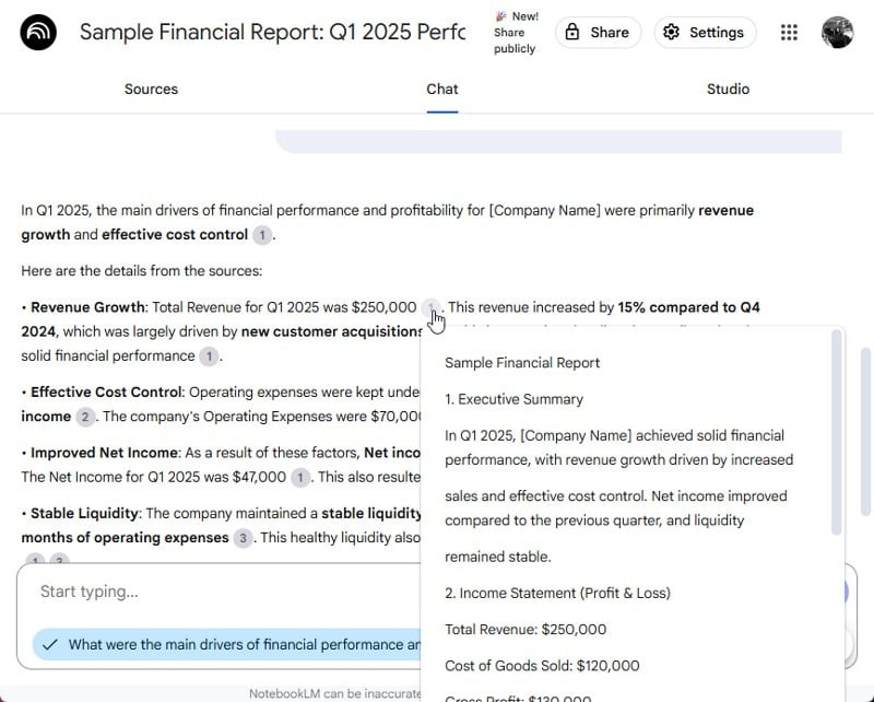 저는 몇 년간의 회사 재무 보고서를 바탕으로 AI를 테스트했습니다. 전년 대비 매출 추세와 같은 주요 요약을 생성하도록 했습니다. 몇 초 만에 연구 보조원은 문서에 언급된 내용뿐만 아니라 명확하고 이해하기 쉬운 형식으로 추세에 대한 자세한 분석을 제공했습니다. 또한 답변 전반에 걸쳐 클릭 가능한 인라인 인용을 제공하여 원본 문서에서 맥락을 직접 확인할 수 있었습니다.