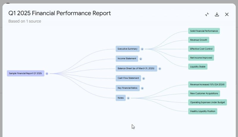 NotebookLM의 가장 인상적인 기능 중 하나는 마인드 맵 생성입니다. 이 도구는 출처의 핵심 개념을 강조하고 그 개념들이 어떻게 연결되는지 보여주는 분기형 시각적 다이어그램을 생성합니다. 또한, 선택한 출처의 콘텐츠를 체계적인 노드로 나누어 조사와 이해를 더욱 쉽게 해줍니다.
