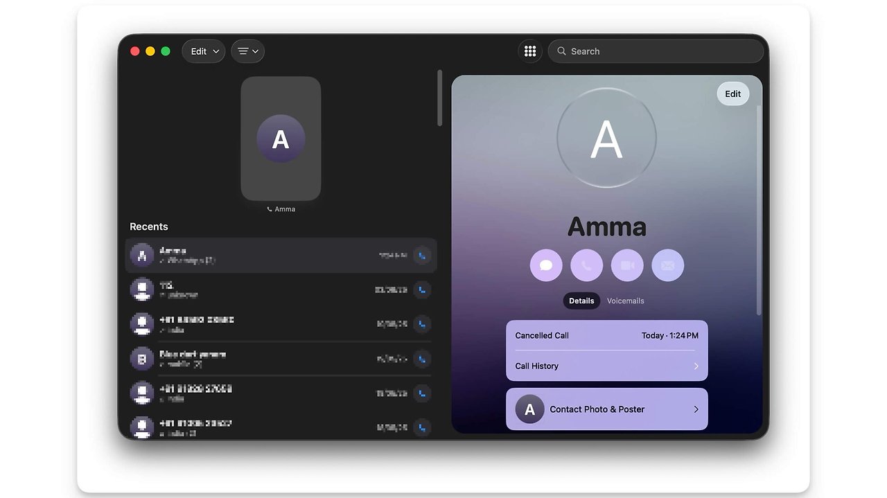 macOS 26에는 이제 전화 앱이 내장되어 Mac에서 바로 전화를 걸거나 받을 수 있습니다. 또한, 유용한 대기 지원 기능과 통화 화면 기능도 Mac에서 아무런 제약 없이 바로 사용할 수 있습니다. 통화 기록, 음성 메모 등도 확인할 수 있습니다.