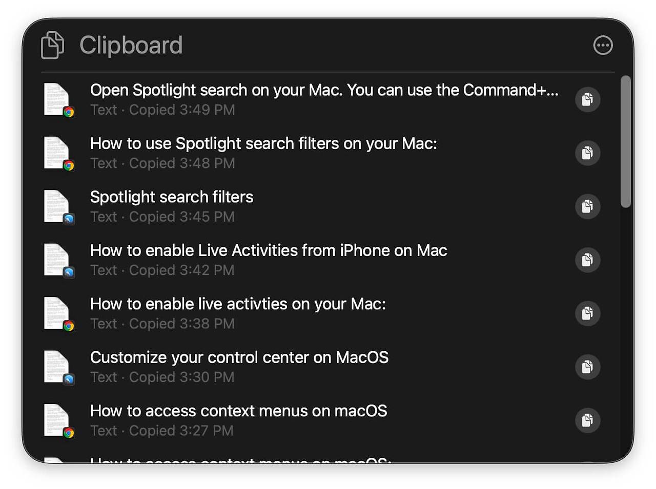 - 여기에서는 복사한 텍스트, 이미지, 파일을 포함한 클립보드 기록을 볼 수 있습니다.