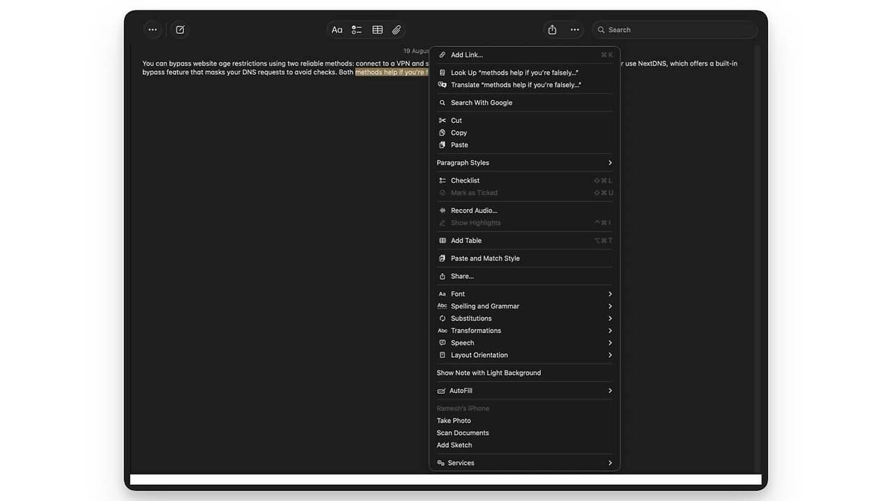 - 노트에서 원하는 텍스트를 선택하고 마우스 오른쪽 버튼을 클릭하세요. 여기에서 모든 도구를 확인할 수 있습니다.