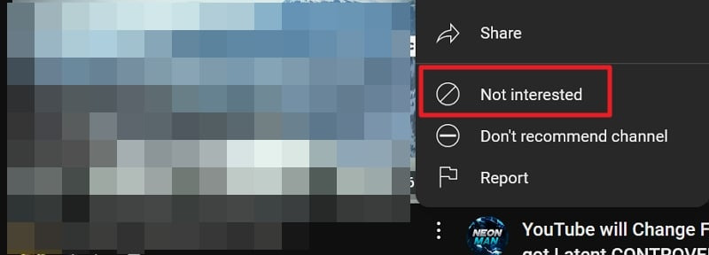 YouTube는 홈페이지의 모든 동영상에 사용할 수 있는 ' 관심 없음' 기능을 제공합니다. 동영상과 재생목록에서 '관심 없음' 버튼을 사용할 수 있습니다. 동영상이나 재생목록 옆에 있는 점 세 개 아이콘을 클릭하고 '관심 없음' 을 선택하세요.