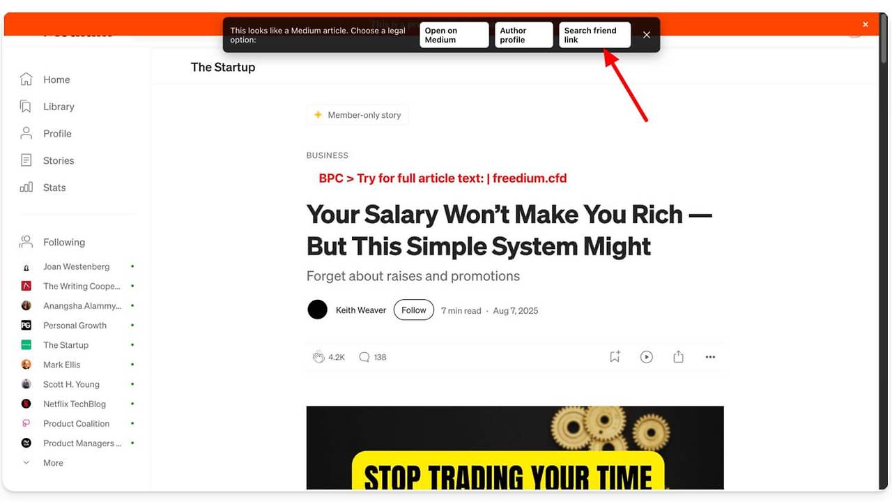저희 유료 콘텐츠 제거 도구는 웹사이트 간 링크 복사/붙여넣기를 방지하는 데 매우 유용합니다. 마지막으로, 두 브라우저 모두에 설치할 수 있는 또 다른 스크립트를 사용하여 친구 기사 링크를 찾을 수 있습니다. 이 가이드가 도움이 되었기를 바랍니다. Medium 기사를 무료로 볼 수 있는 다른 신뢰할 수 있는 방법이 있다면 아래 댓글로 알려주세요.