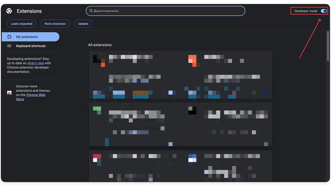 - 이제 확장 프로그램 관리 페이지에서 개발자 모드를 활성화하세요.