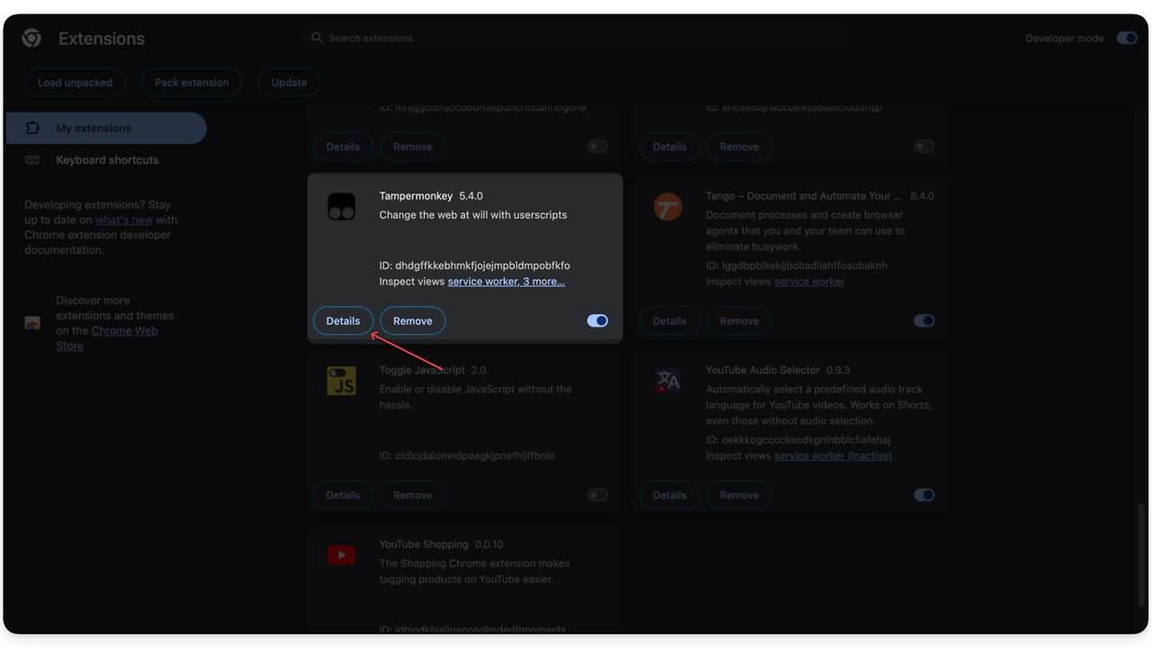 - 확장 프로그램을 활성화한 후 Tampermonkey 확장 프로그램을 찾아 세부 정보를 탭합니다.