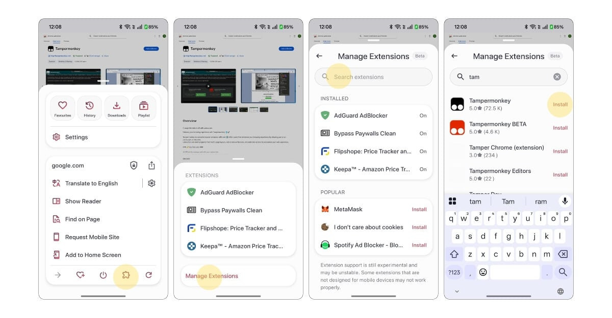 - 브라우저를 열고 하단의 '확장 프로그램' 탭 을 클릭한 다음 ' 확장 프로그램 관리 ' 옵션을 탭하세요. 확장 프로그램 페이지에서 검색창을 사용하여 Tampermonkey 확장 프로그램을 찾은 다음 ' 설치'를 탭하여 모바일 브라우저에 설치하세요.