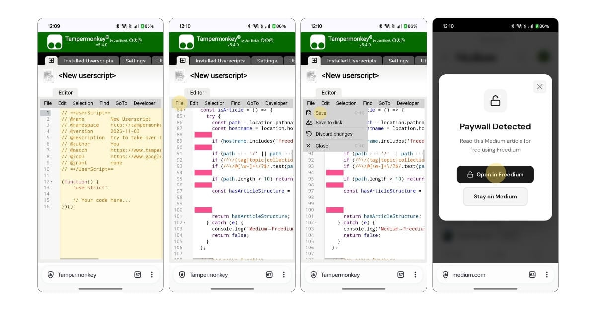 - 이제 스크립트를 복사한 스크립트로 바꾸세요. 저장하려면 툴바에서 파일 옵션을 클릭한 다음 저장을 클릭하세요. 이제 medium.com을 방문하여 프리미엄 게시물을 확인하세요. Freedium에서 열 것인지 묻는 팝업 창이 나타나면 탭하여 무료로 게시물을 읽어보세요.