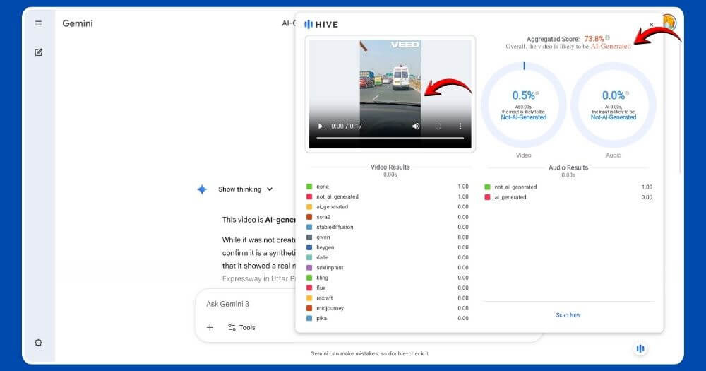 3단계: 그런 다음 "이 비디오는 AI가 생성한 것입니까?"라는 메시지를 입력합니다. Gemini 앱이 해당 비디오가 AI가 생성한 비디오임을 식별합니다.
