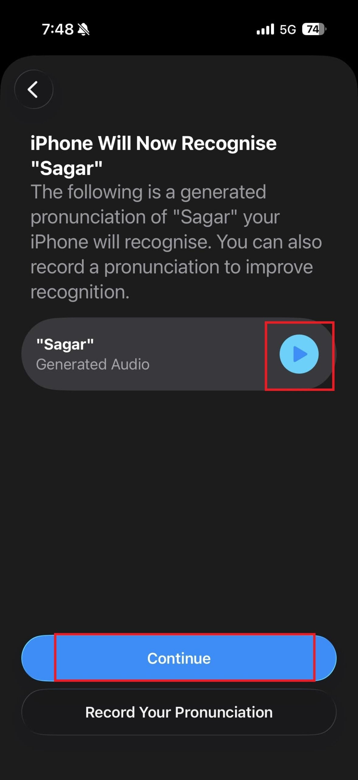 - 다음 화면에서 아이폰은 입력한 모든 이름의 발음을 생성합니다. 재생 버튼을 누르면 들어볼 수 있습니다. 영어 이름은 아시아 이름보다 발음이 더 정확한 경향이 있습니다. 따라서 애플이 생성한 이름이 정확한지 다시 한번 확인해 보는 것이 좋습니다.