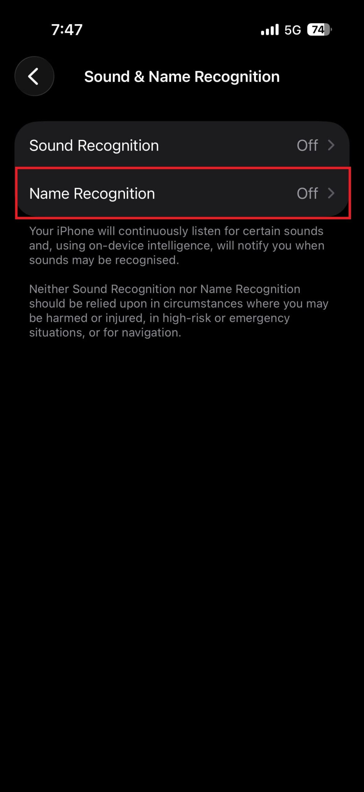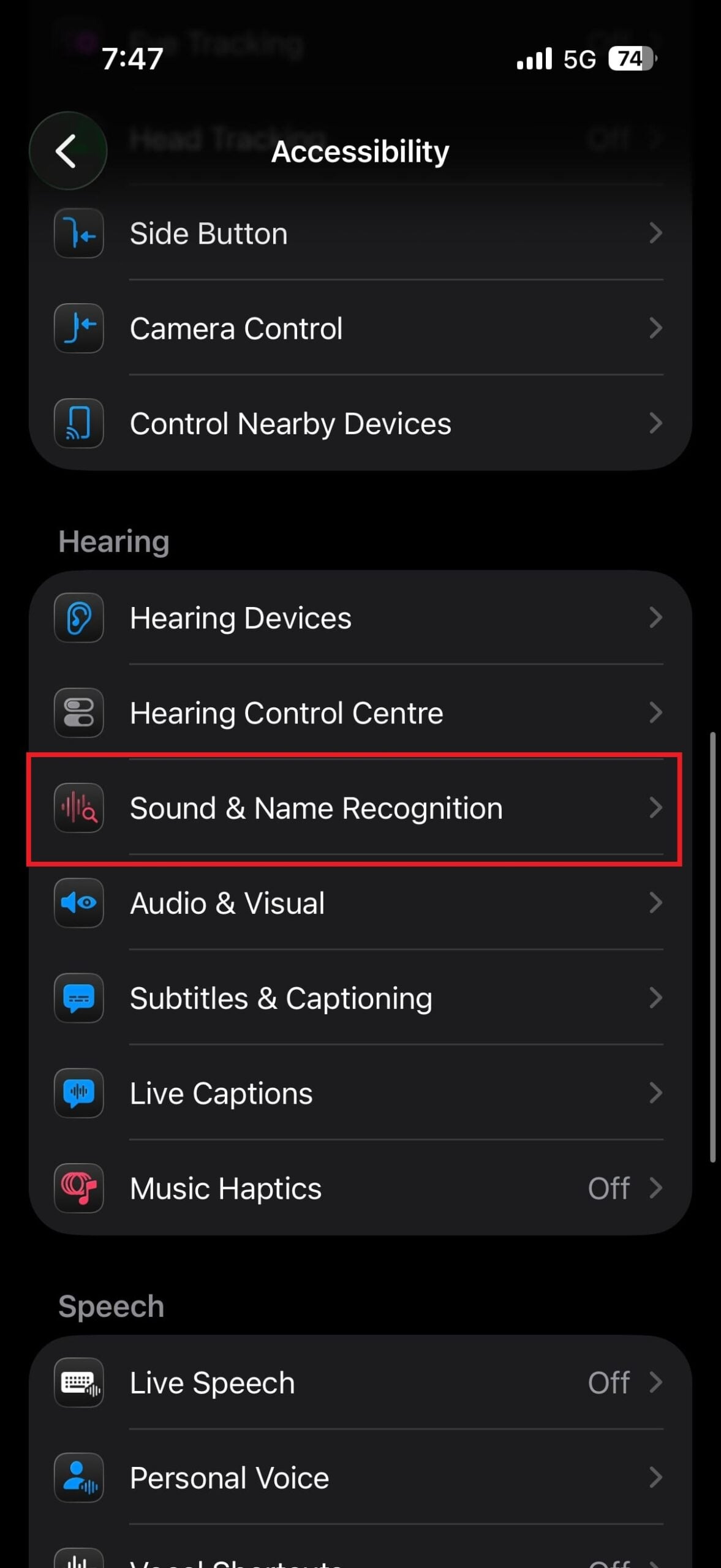 - 청각 섹션 에서 소리 및 이름 인식을 탭하세요.
