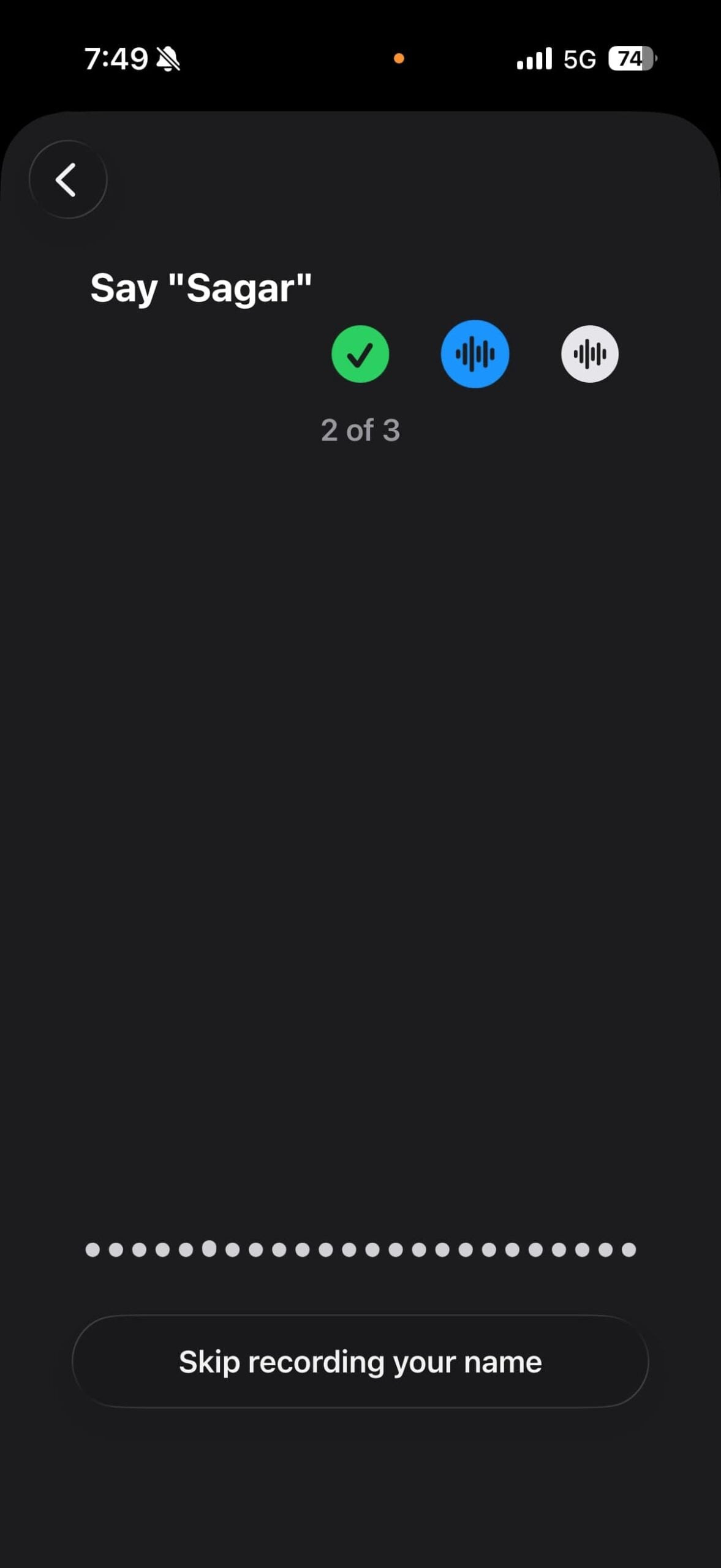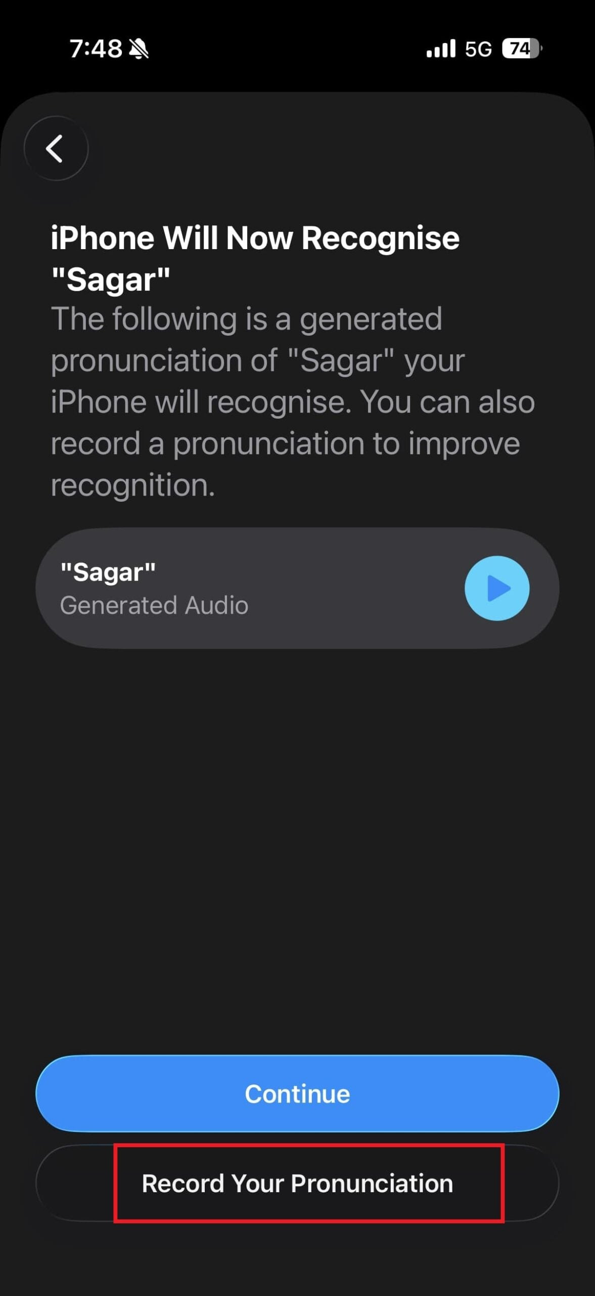 - 본인의 발음을 직접 녹음할 수 있는 옵션이 있습니다. '발음 녹음' 버튼을 누르세요. 기기가 발음을 인식하려면 이름을 세 번 말해야 합니다.