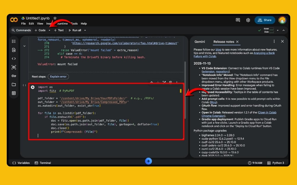 무료 버전을 찾고 있다면 Google Colab을 사용해 보세요. Google Colab은 Python을 사용하여 무료로 파일을 압축할 수 있는 도구입니다. 게다가 기술적인 지식이 없어도 사용할 수 있습니다. 다음의 간단한 단계를 따라해 보세요.