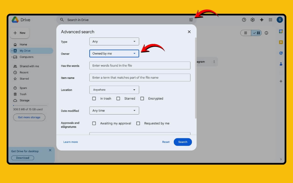 2단계: 상단 사이드바 바로 옆에 있는 필터 아이콘을 클릭하고 파일 형식에서 '내가 소유한 파일'을 선택합니다. 그러면 필요한 모든 파일과 파일 소유자가 표시됩니다.