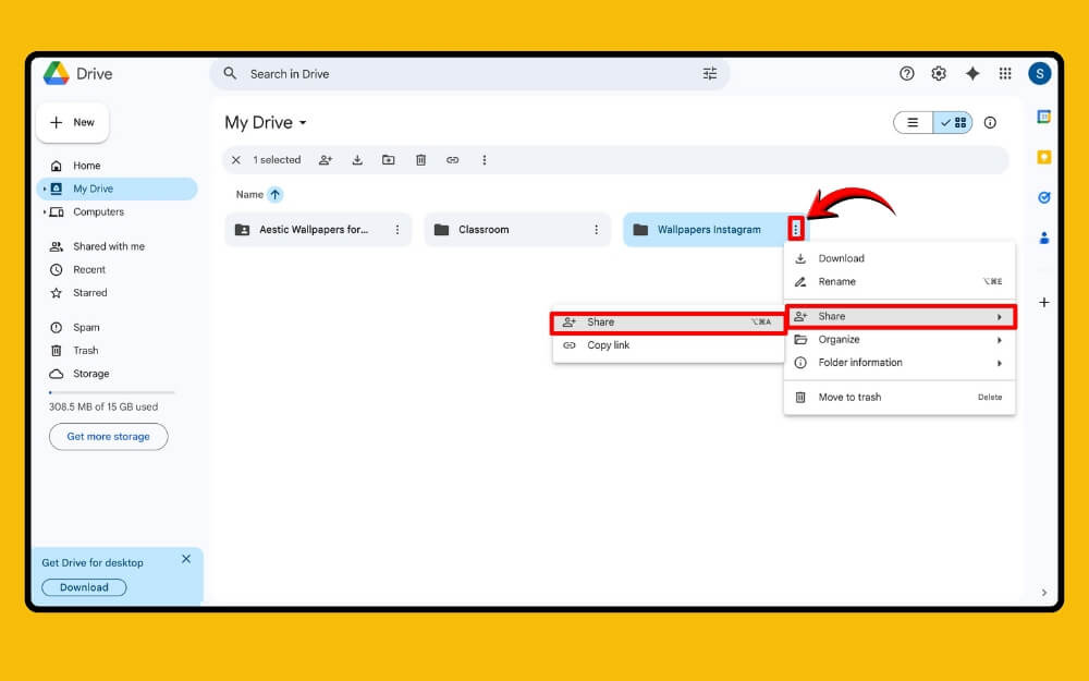 1단계: 브라우저에서 Google Drive를 엽니다. 파일을 마우스 오른쪽 버튼으로 클릭하거나 파일 카드 상단의 점 3개 메뉴를 클릭한 다음 공유 옵션을 클릭합니다.