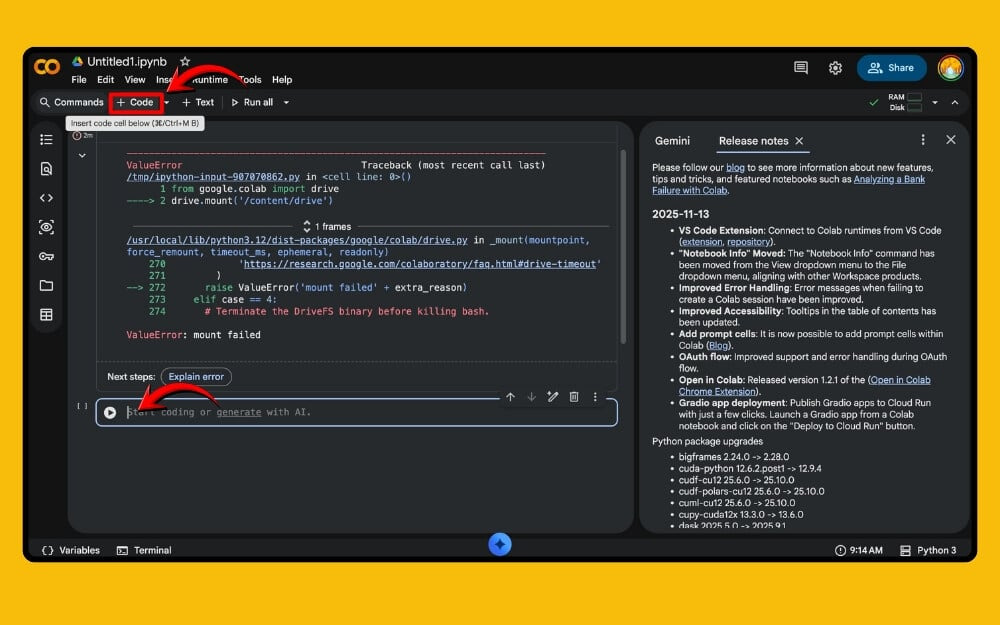 5단계: 이제 상단 도구 모음에서 '+ 새 코드'를 클릭하고 새 코드 입력란을 추가합니다. 코드가 추가되면 다음 코드를 입력하고 Enter 키를 누르거나 재생 버튼을 누릅니다. 코드: !pip install Pillow PyMuPDF
