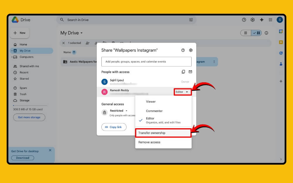 3단계: 추가되면 다시 공유 옵션을 열고 여기에서 역할 드롭다운을 선택한 다음 소유권 이전을 선택합니다.