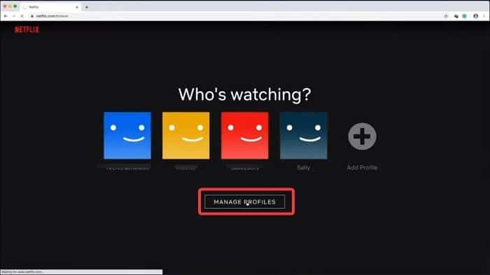 2. 로그인하면 계정에서 사용할 수 있는 다른 프로필이 표시됩니다. 프로필 관리 옵션 을 탭 합니다. 이미 Netflix 프로필을 사용 중이라면 드롭다운 아이콘을 클릭하고 프로필 관리 를 선택하기만 하면 됩니다.