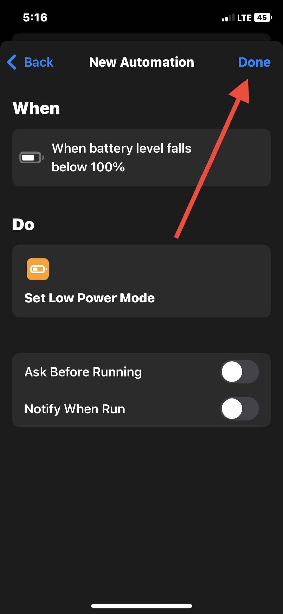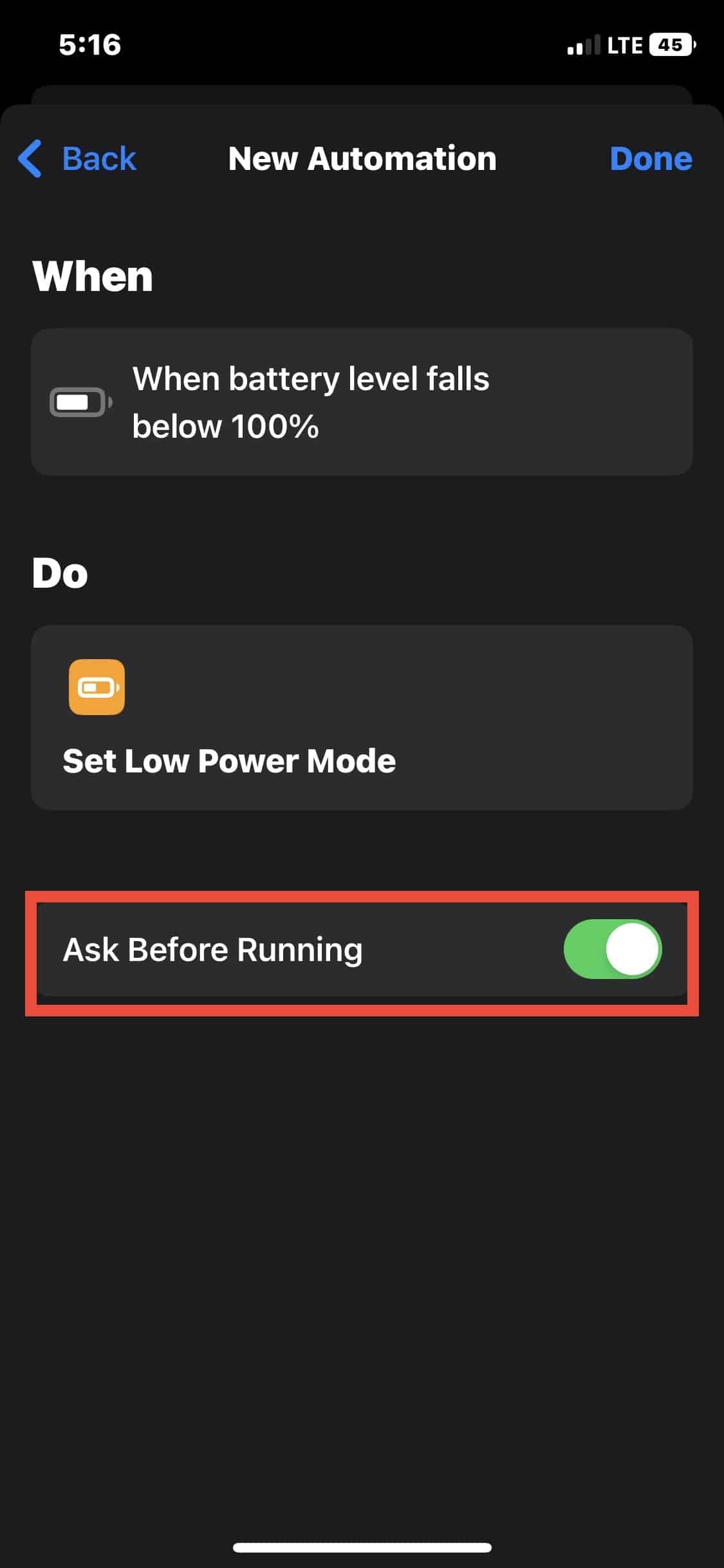 12. 모든 단계를 완료하면 새 자동화 페이지가 나타납니다. 저전력 모드가 자동으로 켜지도록 실행하기 전에 묻기 오른쪽 토글을 누릅니다 ,