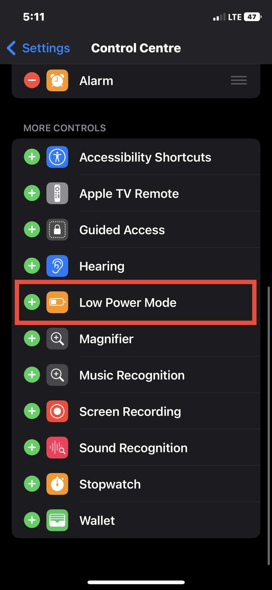 3. 추가 컨트롤 에서 저전력 모드 로 스크롤합니다 ,