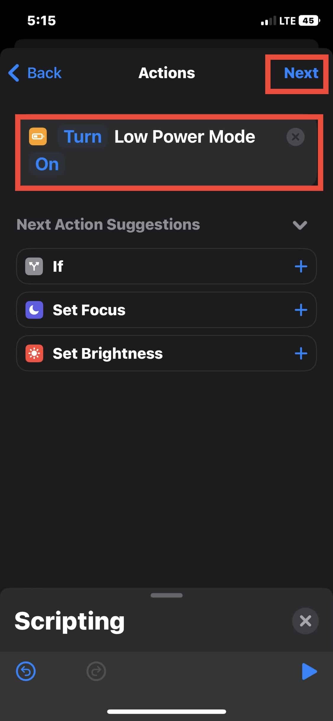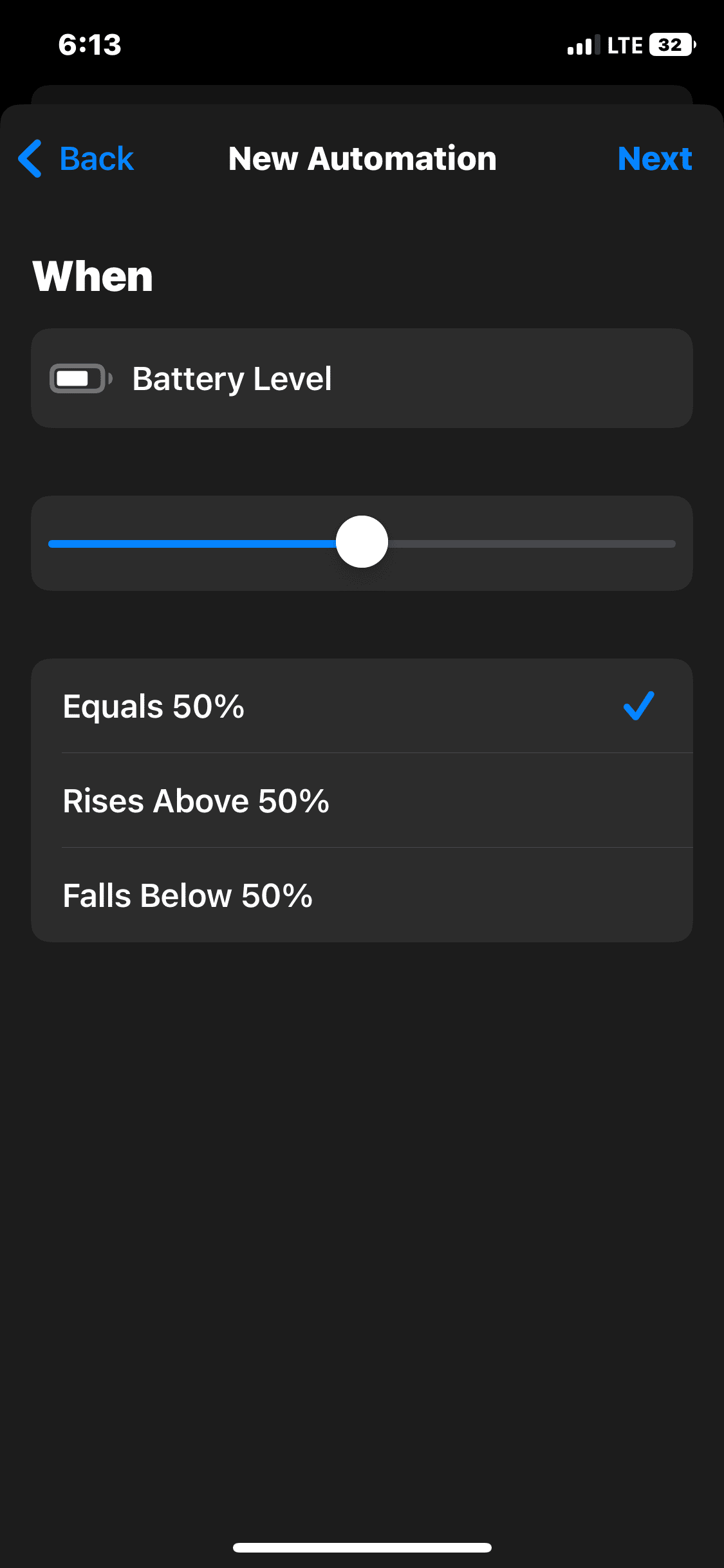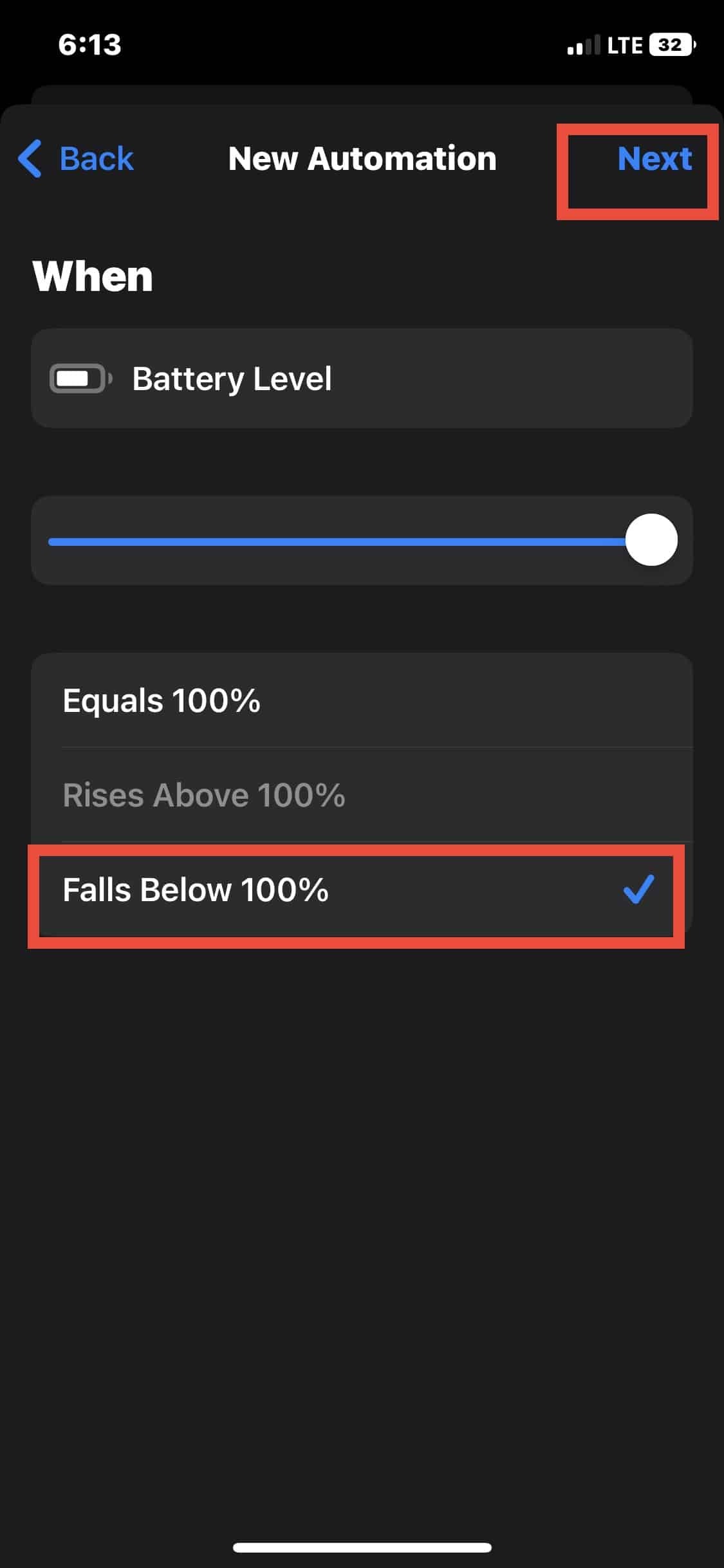 7. 배터리 비율 수준을 선택했으면 % 이하로 떨어지는 옵션을 탭하고 오른쪽 상단 모서리 에서 다음 을 클릭합니다.