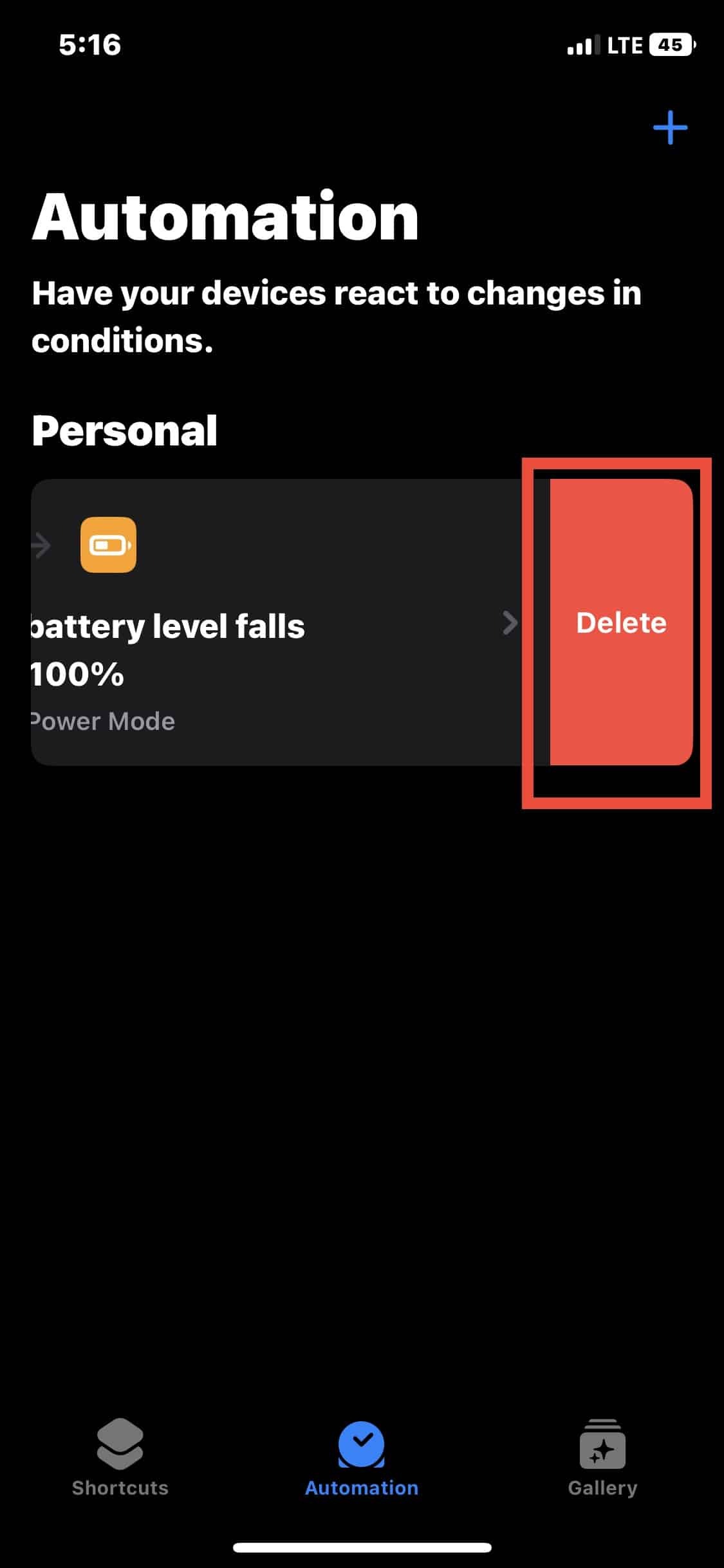 당신 준비 다 됐어요. 이제부터 iPhone이 선택한 배터리 비율보다 적을 때마다 저전력 모드가 자동으로 켜집니다. 혹시라도 나중에 자동화를 삭제하고 싶다면 쉽게 삭제할 수 있습니다. 그렇게 하려면 아래 단계를 따르십시오.