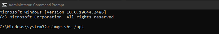 2단계: Windows 10 명령 프롬프트에 있으면 slmgr.vbs /upk를 입력 하고 Enter 키를 눌러 명령을 실행합니다.