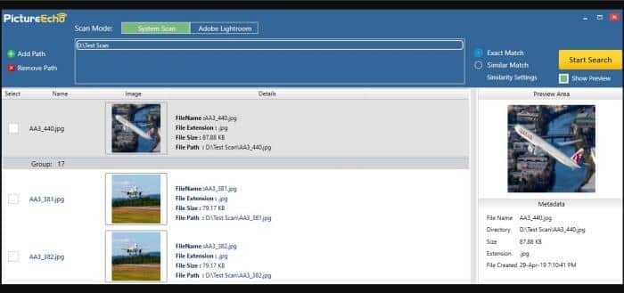 이 프로그램은 Adobe Lightroom에서 중복 사진을 스캔하는 기능과 같이 주로 전문 사진작가를 위한 포괄적인 기능 세트를 제공합니다. 컴퓨터에서 서로 유사한 이미지를 찾을 때 PictureEcho는 4가지 유사도를 제공합니다.