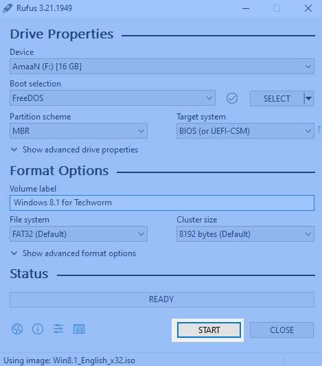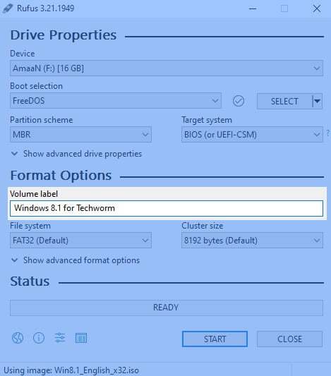 5. 그런 다음 포맷 옵션 섹션으로 이동하여 플래시 드라이브에 이름을 지정합니다. 간단하고 나중에 기억하기 쉽도록 간단한 이름을 지정하는 것이 좋습니다. 우리는 Techworm용으로 Windows 8.1을 제공했습니다.