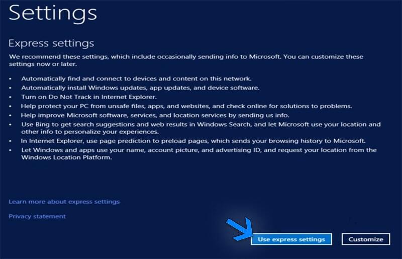 11. 설정 메뉴에서 빠른 설정 사용을 클릭하여 컴퓨터에 대한 Windows 권장 설정으로 이동 합니다. 나중에 OS를 사용하면서 변경할 수 있습니다.