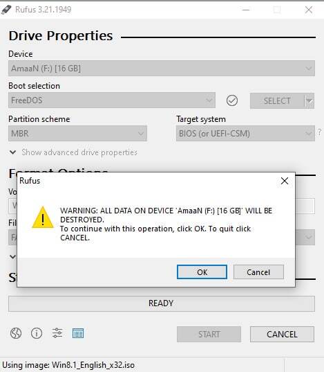 7. 플래시 드라이브를 포맷하고 부팅 가능하도록 Windows 8.1 파일을 추가하기 전에 확인을 위해 확인을 클릭 합니다.