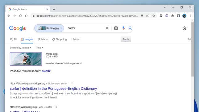 그런 다음 이미지 URL 붙여넣기 (찾고자 하는 이미지가 웹 어딘가에 있는 경우)를 클릭하거나 이미지 업로드 (하드 드라이브의 어딘가에서 이미지 선택)를 클릭하거나 파일 탐색기 또는 Finder에서 이미지를 끌어다 놓을 수 있습니다. 브라우저 탭. 어떤 옵션을 선택하든 시각적으로 유사한 이미지를 포함하여 다양한 결과가 화면에 표시됩니다.