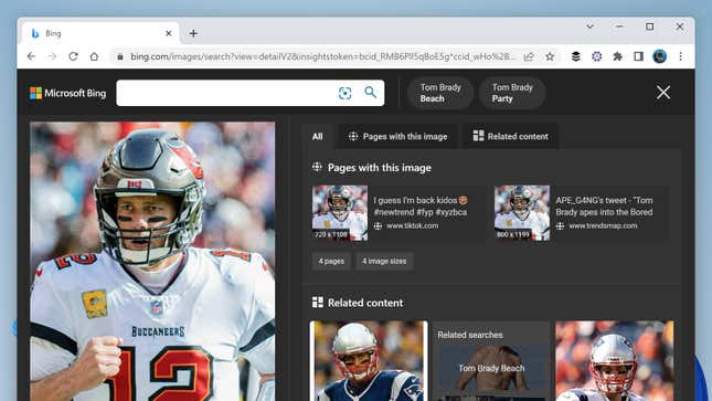 기본 결과 화면의 이 이미지 탭이 있는 페이지는 Bing Visual Search로 보낸 사진의 복사본으로 연결됩니다. 링크를 클릭하면 브라우저에서 페이지를 볼 수 있습니다. 사람의 이미지를 사용하는 경우 해당 사람을 식별하고 특정 상황에서 유용할 수 있는 모양 탭이 표시될 수도 있습니다.