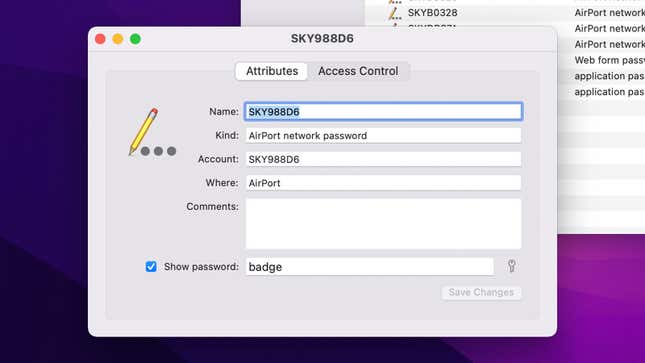 iOS 또는 iPadOS와 달리 macOS에서는 저장된 Wi-Fi 비밀번호를 볼 수 있습니다. 키체인 액세스 앱을 찾아 실행한 다음 로그인 및 암호 탭으로 전환하고 저장된 Wi-Fi 네트워크의 SSID(네트워크 이름)를 검색해야 합니다. 항목을 두 번 클릭한 다음 암호 표시를 클릭 하고 관리자 사용자 이름과 암호를 입력하여 봅니다.