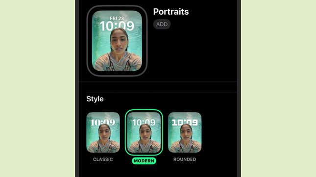 다시 선택할 수 있는 두 가지 컴플리케이션이 있으며 구성 화면 하단에서 설정할 수 있으며 추가 버튼을 탭하여 완성된 시계 모드를 손목에 보내기만 하면 됩니다. 처음에 설명한 방법을 사용하여 iPhone의 사진 앱을 통해서도 이 얼굴을 설정할 수 있습니다. 시작할 인물 사진을 선택하고 인물 사진을 시계 화면으로 선택하면 됩니다.