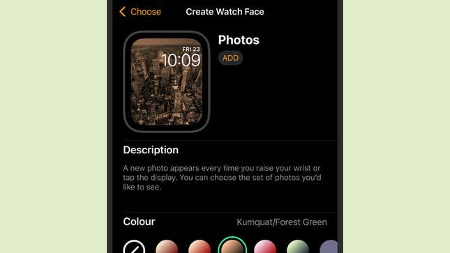 사진 앱을 거치지 않고 iPhone의 시계 앱에서 바로 사진 시계 화면으로 이동할 수도 있습니다. Watch 앱을 연 다음 Face Gallery, Photos를 차례로 탭 합니다. 콘텐츠 제목 아래에 앨범을 선택하거나 휴대전화 라이브러리에서 개별적으로 선택한 사진을 하나 이상 선택할 수 있습니다(최대 24개 이미지 허용).
