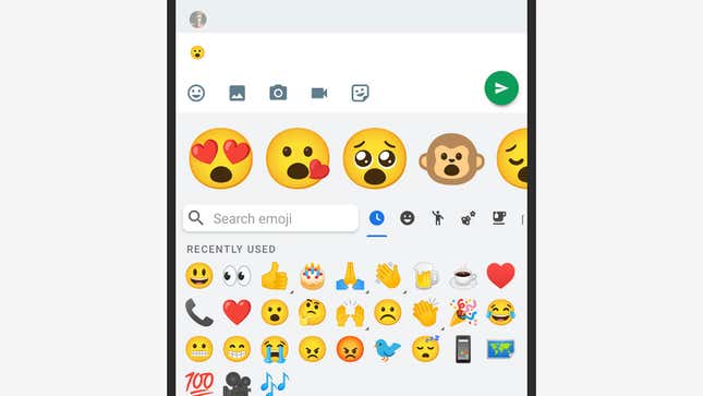 먼저 스페이스 바 왼쪽에 있는 이모티콘 버튼을 탭한 다음 새로 만든 이모티콘의 '기본'으로 사용하려는 이모티콘을 선택하세요. 그러면 키보드 위에 제안 사항이 표시되며 일반적으로 기존 이모티콘의 매시업( 사양 원숭이처럼). 모든 이모티콘이 제안을 생성하는 것은 아니지만 많은 이모티콘이 제안을 생성합니다.