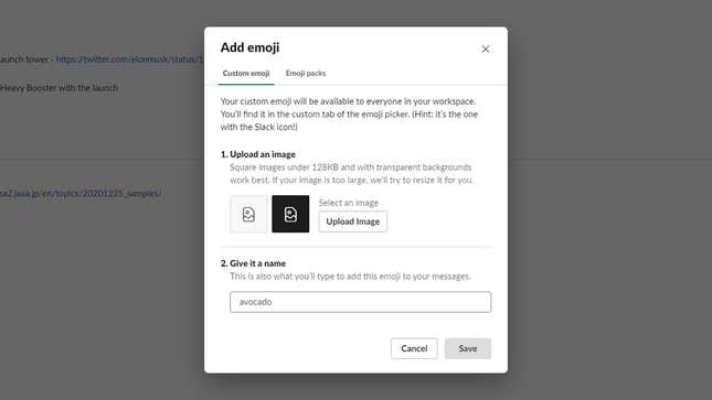 웹의 Slack에서 채널 또는 대화의 이모티콘 버튼을 클릭한 다음 이모티콘 추가를 선택합니다. 버튼이 표시되지 않으면 Slack 채널을 운영하는 사람이 귀하와 같은 부하에 대해 기능을 비활성화한 것입니다. JPEG 또는 GIF일 수 있는 새 사진을 업로드하고 이름을 지정하라는 메시지가 표시됩니다. 이미지를 이모지 크기에 맞춰 보기 좋게 압축하려면 단순하고 깨끗해야 하므로 업로드하는 내용에 대해 현명해야 합니다.