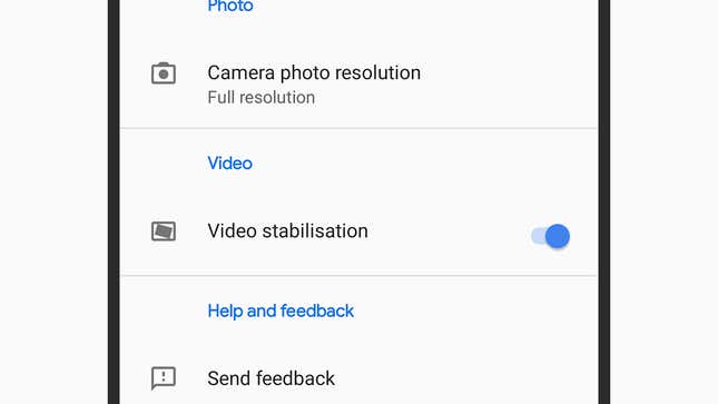 휴대폰의 기본 카메라 앱에서 기본적으로 제공되는 컨트롤에 익숙해지는 것도 중요합니다. Google Pixel의 경우 비디오 모드가 활성화된 상태에서 화면 측면에서 안쪽으로 스와이프한 다음 톱니바퀴 아이콘을 탭하여 관련 설정에 액세스합니다. 하나는 계속 유지해야 하는 비디오 안정화 입니다.