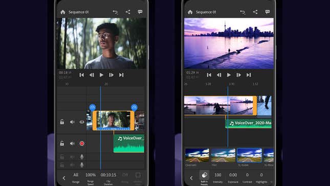 Android 및 iOS 용 Adobe Premiere Rush는 비디오 편집에 보다 전통적인 타임라인 기반 접근 방식을 사용하지만 여전히 빠르고 사용하기 쉽습니다. 가능한 한 빨리 소셜 미디어에 클립을 올릴 수 있도록 설계되었지만 속도 조정 및 음악 오버레이와 같은 기능을 사용하여 모든 종류의 시나리오에 대해 모든 종류의 비디오를 제작할 수 있습니다. 앱의 고급 기능을 사용하려면 월 5달러의 구독이 필요하지만 무료로 사용할 수 있습니다(Creative Cloud 구독자인 경우 무료).