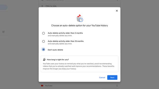 추천 항목에 영향을 미칠 준비가 되었으면 YouTube에 시청한 내용을 기록하지 않도록 지시할 수 있습니다. YouTube 기록 페이지에서 활동 저장을 클릭 하고 토글 스위치를 끕니다. 특정 시간이 지난 후 YouTube에서 기록을 자동 삭제하도록 하려면 자동 삭제를 선택한 다음 선택합니다. 나머지 Google 활동과 마찬가지로 3개월 또는 18개월 동안만 기록을 유지하도록 YouTube에 지시할 수 있습니다.