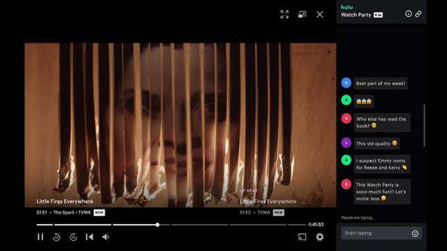 그것을 클릭하면 최대 8명의 시청자와 함께 시청이 시작됩니다. 체인 모양의 아이콘을 클릭하여 가상 모임의 고유 URL을 얻은 다음 함께 보고 싶은 다른 사람들에게 전달하여 화면 측면에 대화방을 완성할 수 있습니다. Hulu는 여기에 자세한 내용이 있습니다.