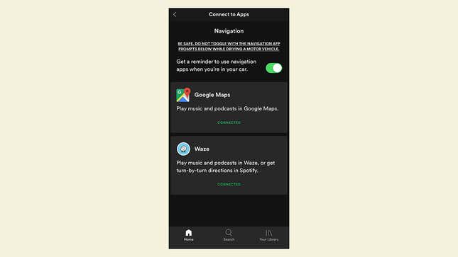 Google 지도의 경우 Google 지도 내에서 연결합니다. 앱 메뉴에서 설정을 선택한 다음 내비게이션 설정 과 미디어 재생 컨트롤 표시 (Android) 또는 내비게이션 및 음악 재생 컨트롤 (iOS)을 선택합니다. Waze의 경우 Spotify로 이동하여 내비게이션 (Android) 또는 앱에 연결 (iOS)을 선택합니다.