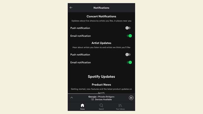휴대폰에서 Spotify 설정 페이지로 이동한 다음( 홈 탭 의 오른쪽 상단 모서리에 있는 톱니바퀴 아이콘 탭 ) 알림 까지 아래로 스크롤하여 콘서트 알림 비트를 찾습니다. 앱 알림을 통해 알림을 받을 수 있습니다. 또는 이메일을 통해.