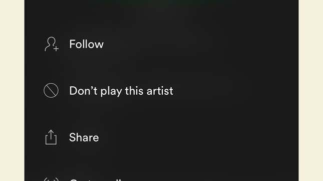 아티스트 페이지에서 메뉴 버튼(오른쪽 상단에 있는 세 개의 점)을 탭한 다음 이 아티스트를 재생하지 않음을 선택 하면 해당 아티스트의 노래를 수동으로 선택하고 들을 수도 없습니다. 동일한 메뉴에서 아티스트 음소거를 다시 해제할 수 있습니다.