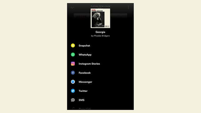 소셜 미디어는 처음부터 Spotify에 내장되어 있지만 더 이상 Facebook 친구의 취향만 추적하지는 않습니다. 팔로워의 음악적 취향을 향상시키려는 경우 좋아하는 Spotify 곡을 Instagram 및 Snapchat으로 바로 보낼 수 있습니다(아마도 헛된 노력일 수 있지만 여전히). 이러한 앱을 사용하면 원하는 경우 Spotify 링크 위에 스티커, 텍스트 및 모든 일반적인 장식을 추가할 수 있습니다.