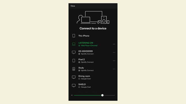 이 작은 버튼은 Sonos 앱을 열거나 표준 Chromecast 인터페이스를 사용하지 않고도 Spotify 곡을 예를 들어 Sonos 스피커 또는 Chromecast로 보낼 수 있습니다. Spotify에 로그인한 모든 장치가 목록에 표시되며 여기에는 웹 브라우저 내부에 Spotify가 포함됩니다.