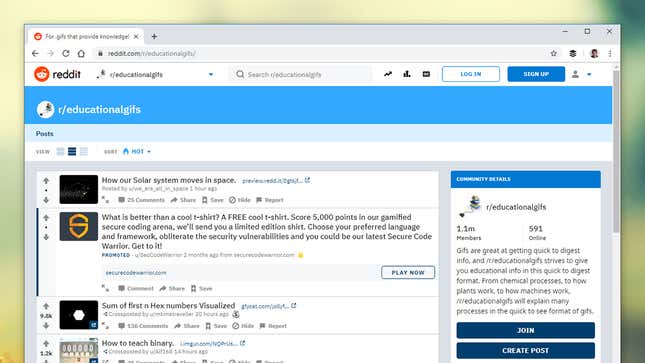 웹에는 있는 그대로의 GIF가 충분하지만, educationgifs 하위 레딧의 GIF는 최신 밈을 전달하는 것이 아니라 무언가를 가르치기 위한 것입니다. 그것은 우리가 본 것 중 가장 흥미를 끄는 하위 레딧 중 하나입니다. 성냥이 어떻게 만들어지는지, 인터넷 케이블이 어떻게 연결되는지, 우리가 방출하는 CO2의 양을 몇 초 만에 알아보세요.