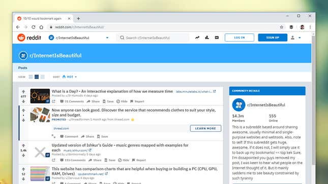 웹에서 새로운 것을 찾는 것은 어려울 수 있으며, 우리 대부분은 매일 같은 소수의 웹 사이트와 소셜 미디어 피드를 순환하게 됩니다. InternetIsBeautiful 서브레딧이 치료법입니다. 재미있고 매력적이며 종종 매우 유익한 웹 사이트 목록이 지속적으로 업데이트됩니다( 여기에는 사진을 색칠하기 위한 웹 사이트가 있습니다).