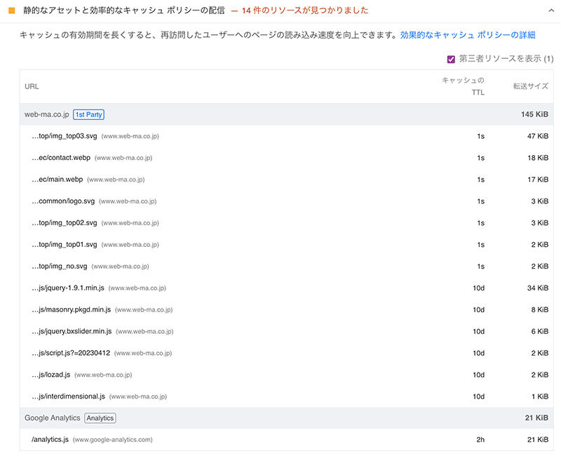 정적 자산 및 효율적인 캐시 정책 배포각 파일의 캐시 기간에 대한 검사입니다. 당 사이트의 경우, .htaccess의 설정 내용을 변경했습니다.