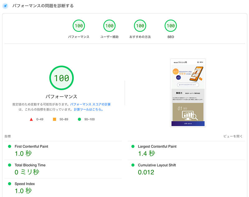 퍼포먼스는 83점, 접근성이 80점, 추천 방법과 SEO는 100점입니다. 이대로도 고득점의 부류입니다만, 100점 획득이 기사의 취지이므로, 한층 더 득점 증가를 노립니다.